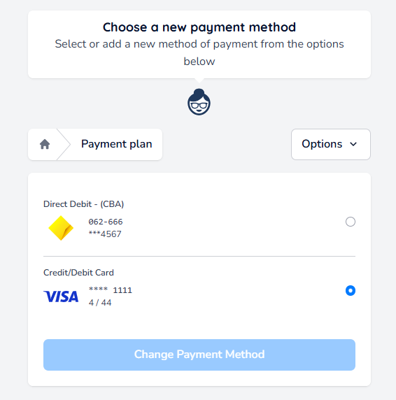 - If needed, add a new payment method and update your plan before continuing - add a new payment method