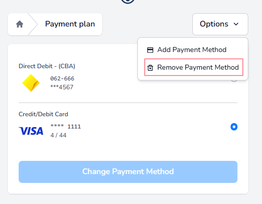 - You cannot remove a payment method if it’s linked to an active payment plan.