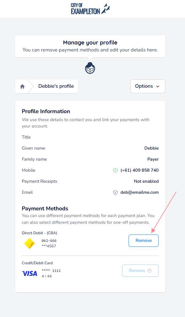 A view showing your profile details will appear, and the payment methods. It's important to note that you may not be able to remove a payment method if it is attached to an active plan.