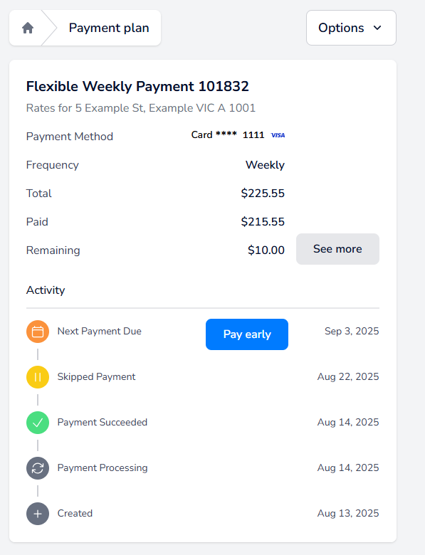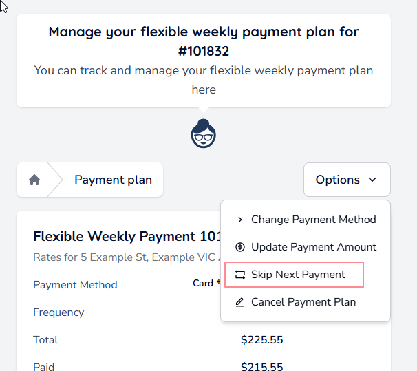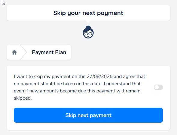 It's important to note that not every plan has the option to skip an upcoming payment. Skipping a payment may mean that the remaining deductions/instalments for your plan may increase to cater for the skipped payment - this depends on the plan type and time of year.
