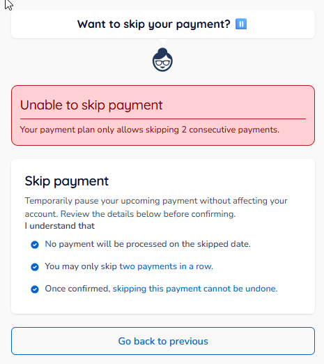 After you have reached the maximum skips permitted for your plan, the following screen will appear - you must make a payment before you can skip again.