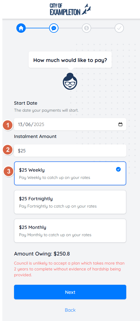 You will need to enter the proposed amount that you wish to pay, and the frequency for payments.