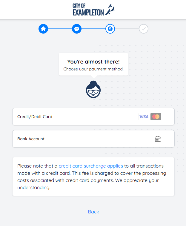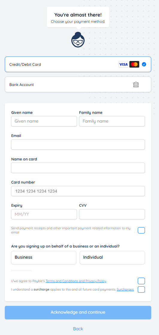 Enter applicable details, and click the 'Acknowledge and continue button.' The form in input fields will vary between Credit/Debit Card and Bank Account.