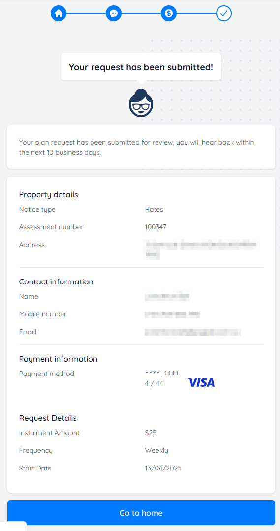 A summary will appear. You must now wait for the Council to respond by either accepting or rejecting your plan. You will be notified automatically via SMS or Email on the outcome when made.
