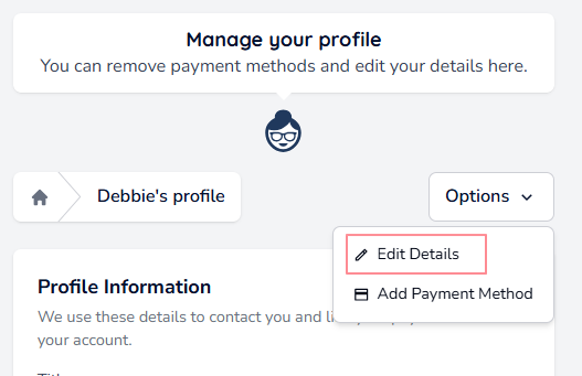 From the Options drop-down menu on the profile screen, select Edit Details