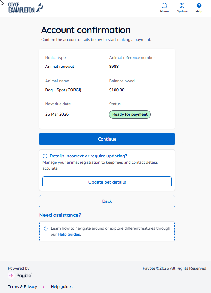 Two payment options are available when paying your animal registration renewal — a one-off payment or an autopay plan. Both options are explained separately within this guide.