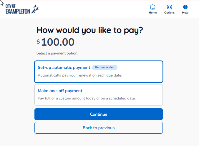 - On the payment options screen, select Set-up automatic payment, then click Continue.