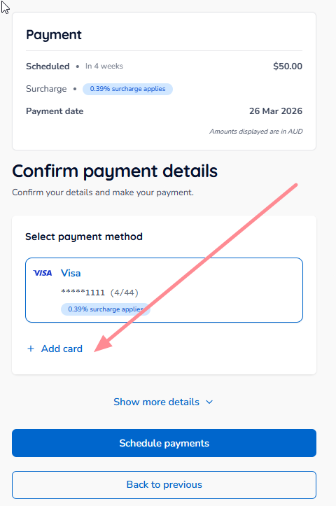 - Select card and then click Schedule payments