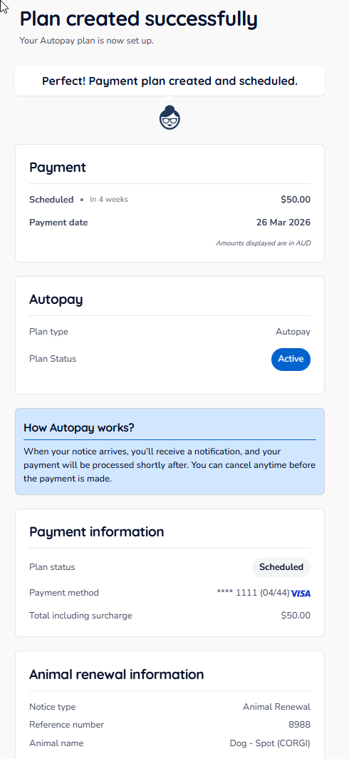 Please note: Once set up, your autopay plan will automatically continue each animal registration year unless cancelled. The renewal amount may change year to year in line with updated registration fees. You may cancel or update your plan at any time before a payment is processed.