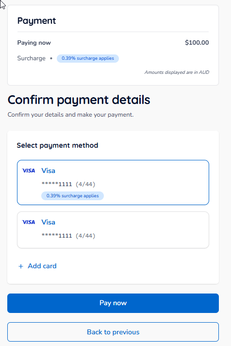 - You can select an existing card (if you've previously used Payble) or add a new card by clicking the Add card button shown above.