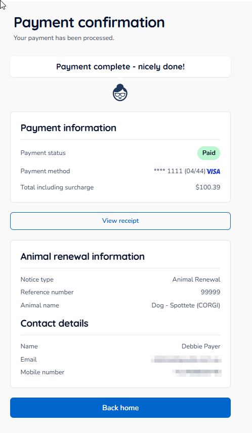- Once your payment has been processed, a payment confirmation screen will appear, confirming the payment was successful, along with a summary of your animal renewal information.